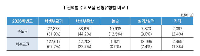 권역별 수시모집 현황을 살펴 보면 수도권은 학생부교과(약 32%,학생부 종합 약 44%,논술 약 12% 로 학생부 종합전형 모집 비율이 가장 높고 2025년 보다 수시 모집 인원이 증가 하였습니다.