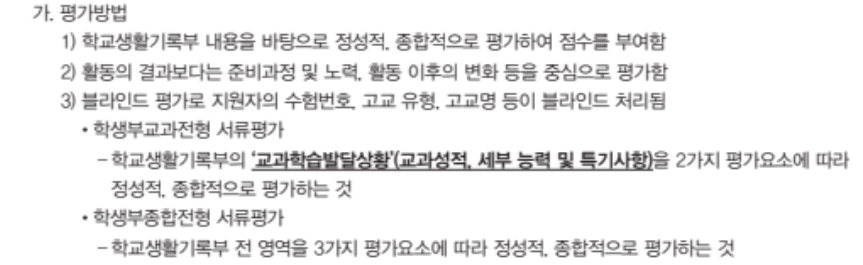 평가 방법은 학교생활기록부 내용을 바탕으로 정성적,종합적으로 평가하여 점수를 부여하고 있습니다.