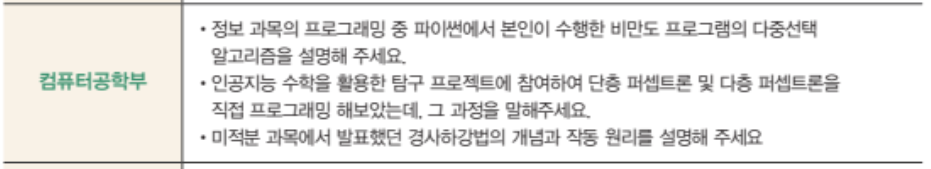 인성을 중심으로 학교생활 충실성을 종합평가하며 서류 내용의 진위여부를 확인하기 위해 컴퓨터공학부 같은 경우에는 위와 같은 질문을 예시로 들었는데요~