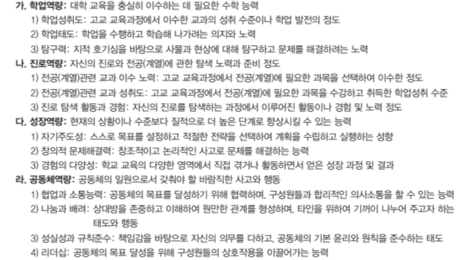 평가요소는 학업역량,진로역량,성장역량,공동체 역량등을 평가하고 있으며