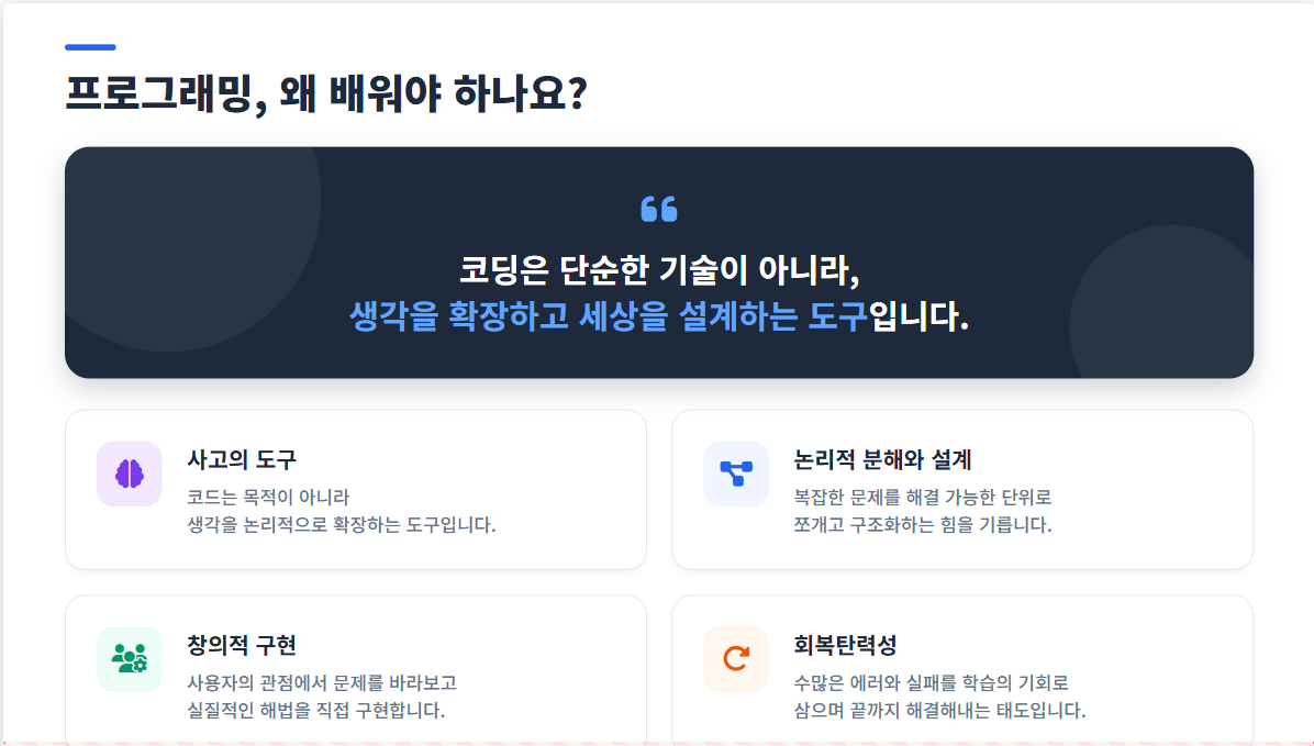 많은 학부모님들이 "코딩학원 보내면 되는 거 아닌가요?"라고 물으십니다.