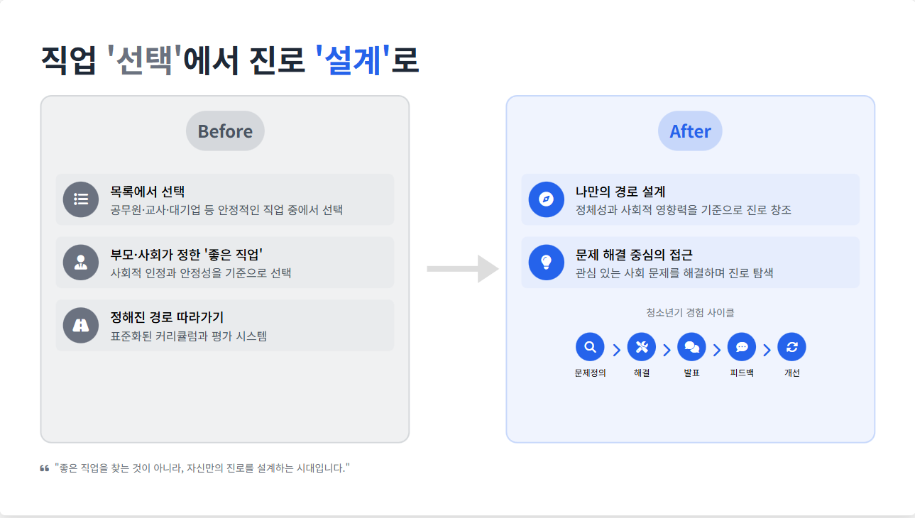 "뭐 하고 싶니?"라고 물었을 때, 우리 아이들의 대답은 "의사", "변호사"가 아니라 "기후 변화 문제를 해결하고 싶어요", "게임으로 사람들을 즐겁게 하고 싶어요", "AI로 공부를 더 쉽게 만들고 싶어요" 같은 답이 나와야 자연스러운 시대입니다.