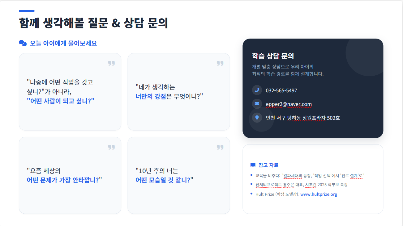 💬 상담 문의 학생 개별 맞춤 상담을 통해 우리 아이에게 맞는 학습 경로를 함께 찾아갑니다. 정답을 제시하는 것이 아니라, 함께 길을 찾아가는 조력자가 되겠습니다.
