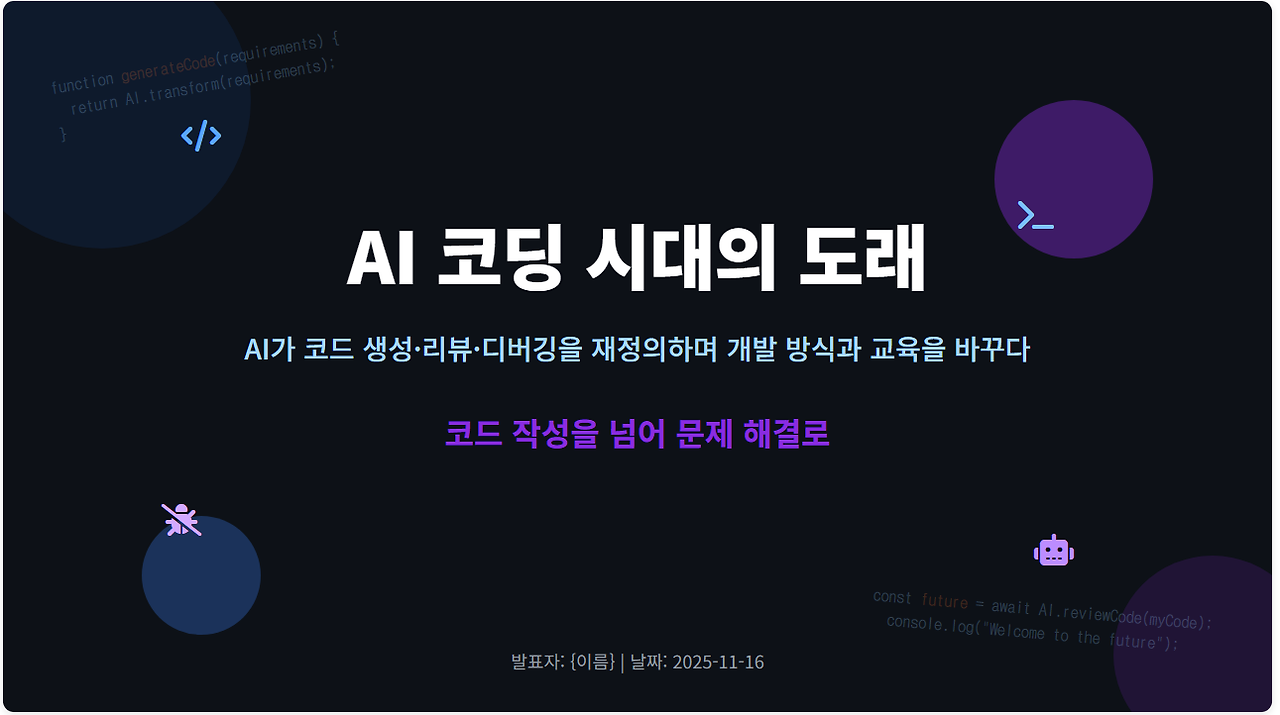 본 문서는 AI 코딩 시대의 도래를 알리고, AI가 코드 생성, 리뷰, 디버깅에 미치는 영향에 대해 논합니다. GitHub Copilot의 등장 이후 ChatGPT, Claude, Cursor 등 다양한 AI 코딩 도구들이 등장하면서 프로그래밍 환경이 급격하게 변화하고 있습니다. AI는 이제 단순한 코드 제안을 넘어 전체 프로그램 작성, 오류 발견, 코드 품질 개선 등 다양한 역할을 수행하며 프로그래머의 강력한 파트너가 되고 있습니다. 본 문서는 AI의 코드 생성, 리뷰, 디버깅 능력과 주요 AI 코딩 도구들을 소개하고, AI 코딩 시대가 프로그래밍 교육과 개발 방식에 미치는 의미를 살펴봅니다.