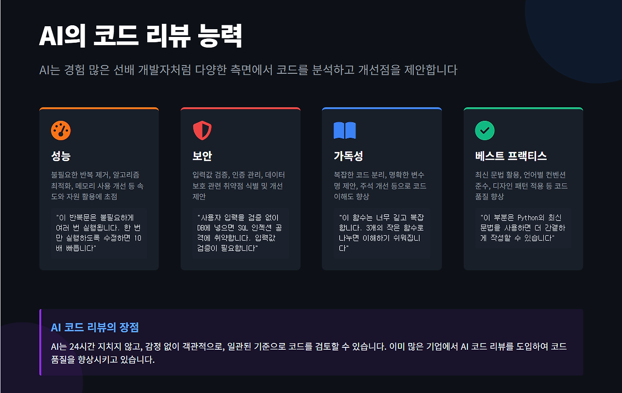 실제로 많은 기업에서 AI 코드 리뷰를 도입하여 코드 품질을 향상시키고 있습니다. AI는 24시간 지치지 않고, 감정 없이 객관적으로 코드를 검토할 수 있다는 장점이 있습니다.