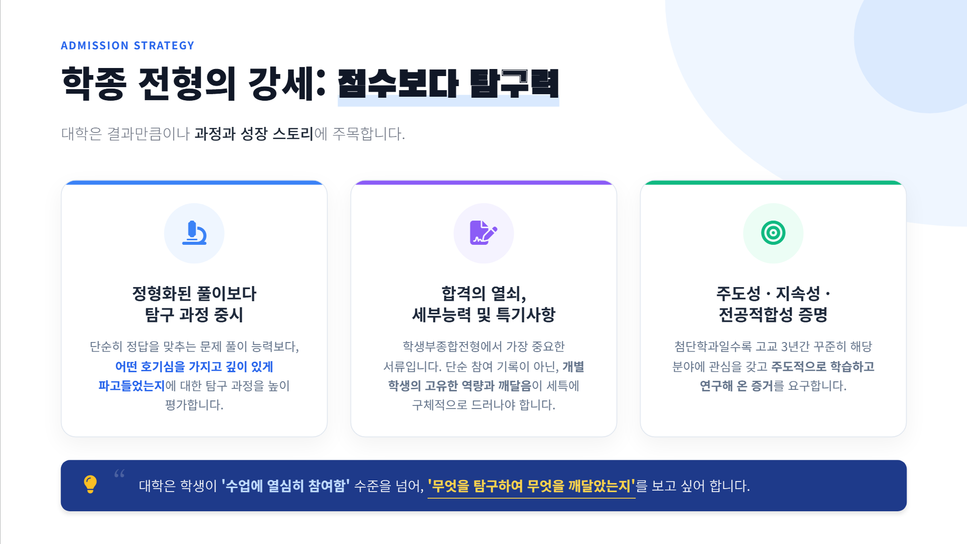 대학은 학생이 "어떤 호기심을 가지고, 어떻게 탐구하여, 무엇을 깨달았는지"를 보고 싶어 합니다. 단순히 "수업에 열심히 참여함" 수준의 기록으로는 경쟁력을 갖기 어렵습니다.