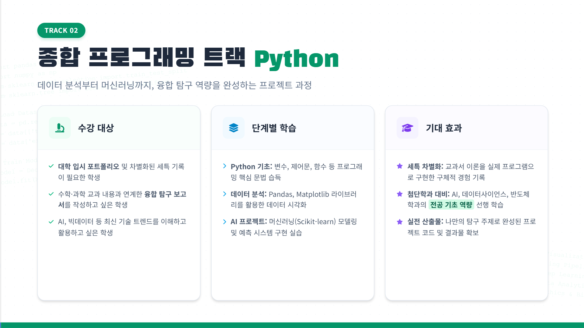 - 첨단학과(AI, 데이터사이언스, 반도체 등) 진학 기반 마련