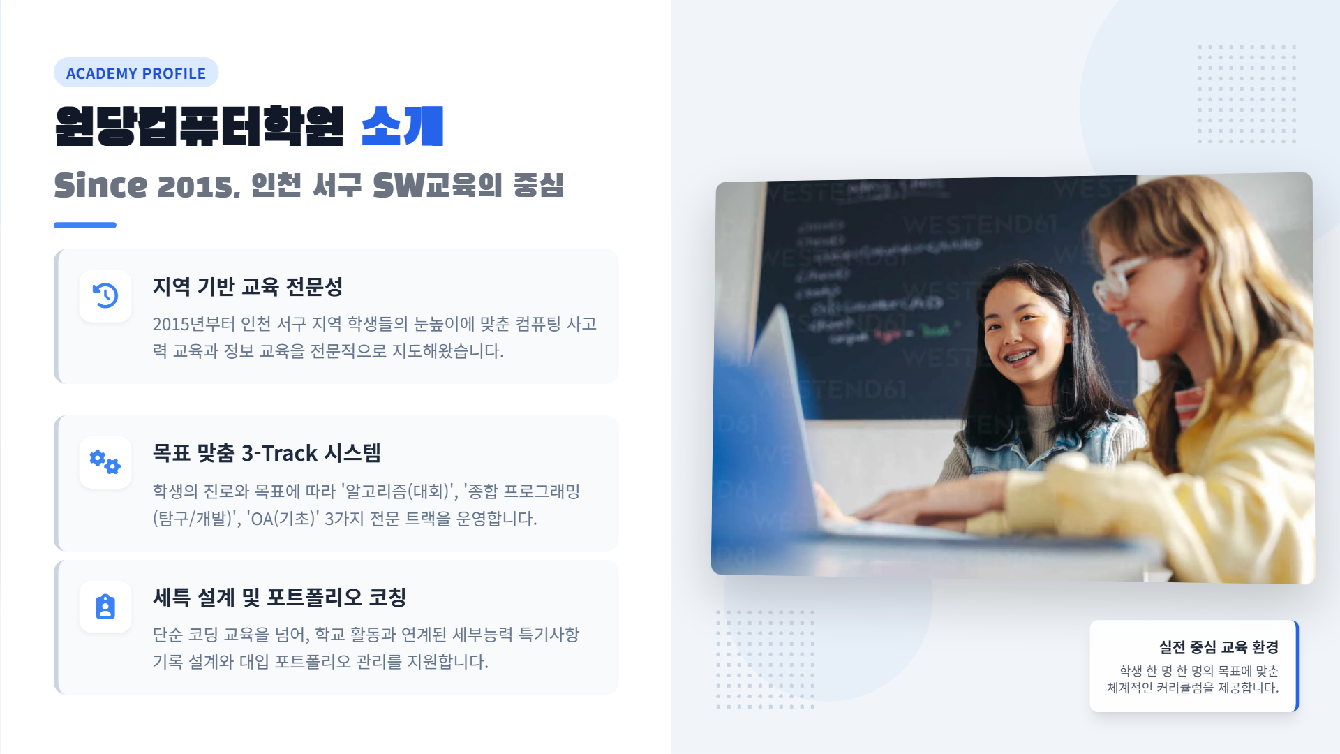 원당컴퓨터학원은 2015년부터 인천 서구 지역에서 학생들의 이런 목표 달성을 돕고 있습니다.