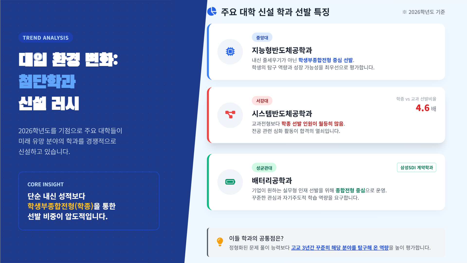 최근 대학입시 현장에서 중요한 변화가 일어나고 있습니다. 반도체, 인공지능(AI), 배터리 등 첨단 분야 학과들이 대거 신설되고 있고, 이들 학과는 내신 성적보다 학생부종합전형을 통한 선발에 집중하고 있다는 점입니다.