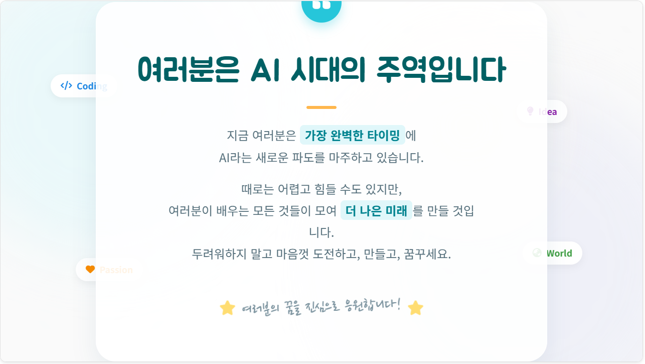 여러분이 코딩만 잘하면 되는 것이 아니라, AI가 우리 사회에 미칠 영향까지 고민하는 인재로 성장할 수 있는 환경이 마련되는 것입니다.