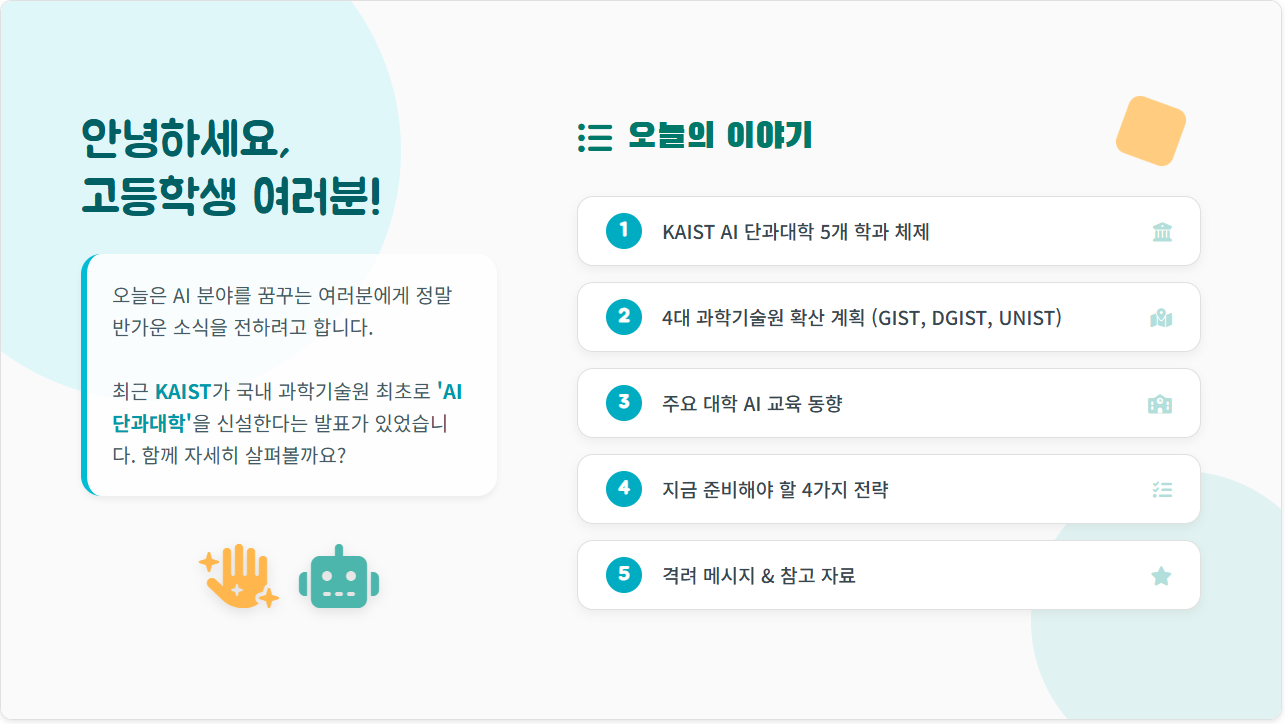 오늘은 AI 분야를 꿈꾸는 여러분에게 정말 반가운 소식을 전하려고 합니다. 최근 KAIST가 국내 과학기술원 최초로 'AI 단과대학'을 신설한다는 발표가 있었습니다. 함께 자세히 살펴볼까요?