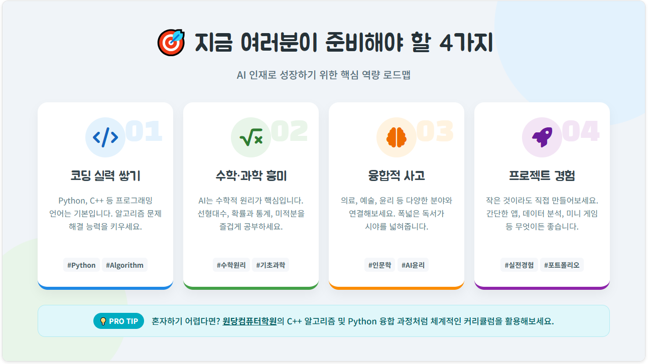 Python, C++ 같은 프로그래밍 언어는 기본입니다. 알고리즘 문제 해결 능력을 키우는 것이 중요합니다. 원당컴퓨터학원처럼 체계적인 커리큘럼으로 C++ 알고리즘과 Python 융합 교육을 제공하는 곳에서 실력을 다지는 것도 좋은 방법입니다.