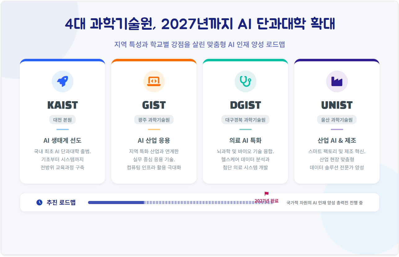 더욱 고무적인 것은 KAIST를 시작으로 2027년까지 GIST(광주), DGIST(대구경북), UNIST(울산) 등 4대 과학기술원 전체에 AI 단과대학이 설립된다는 점입니다. 각 학교마다 지역 특성에 맞춘 특화 교육이 준비되고 있습니다: