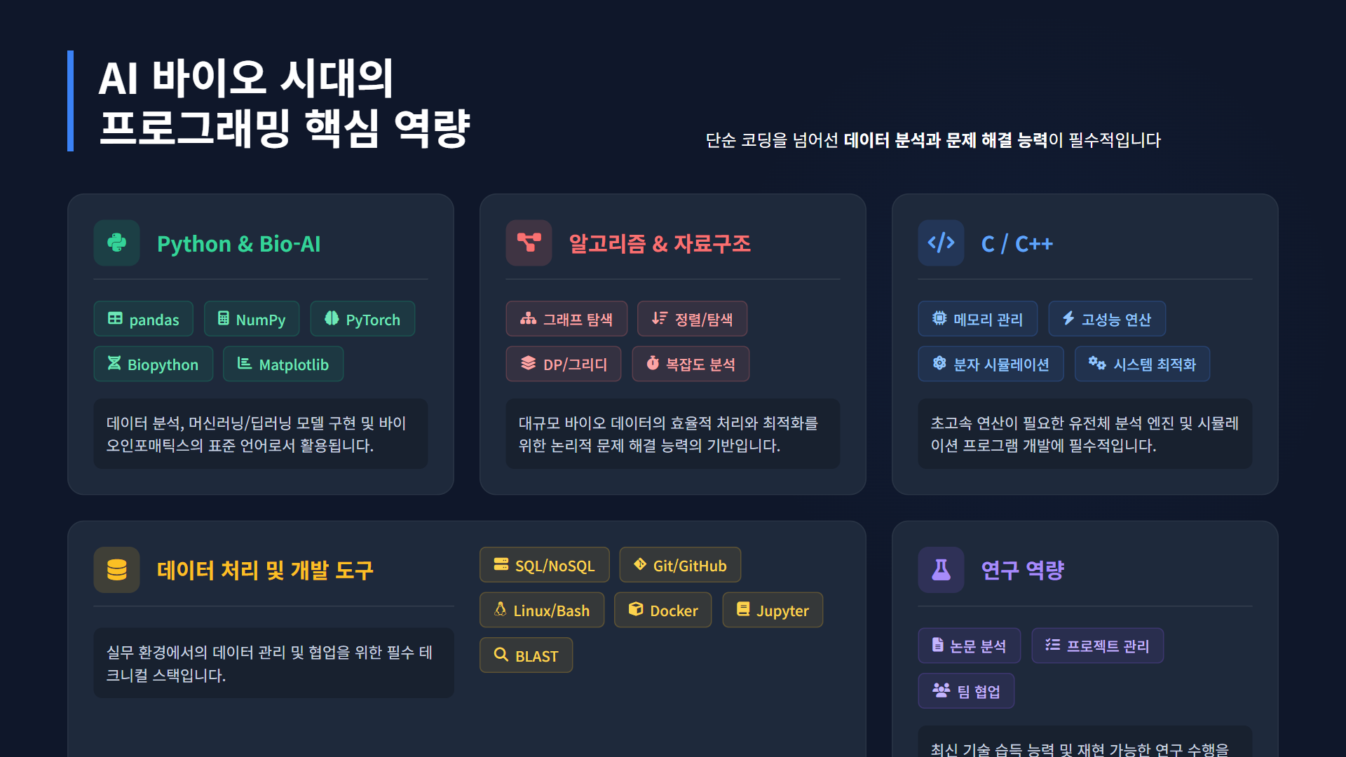 AI 바이오 분야는 생명과학 지식뿐만 아니라 데이터 분석, 알고리즘 개발, 머신러닝 구현 등 프로그래밍 능력이 필수적입니다. 특히 다음과 같은 프로그래밍 기술들이 중요합니다.