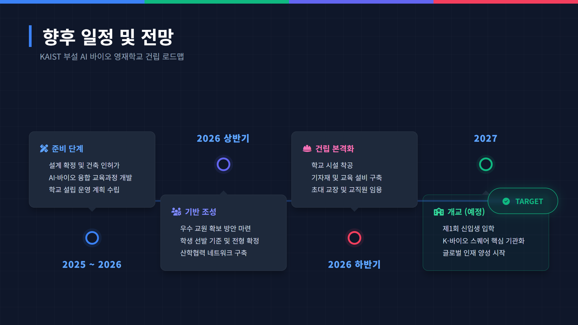 AI 바이오 영재학교는 부지 확정에 따라 다음과 같은 절차를 거쳐 개교할 예정입니다.