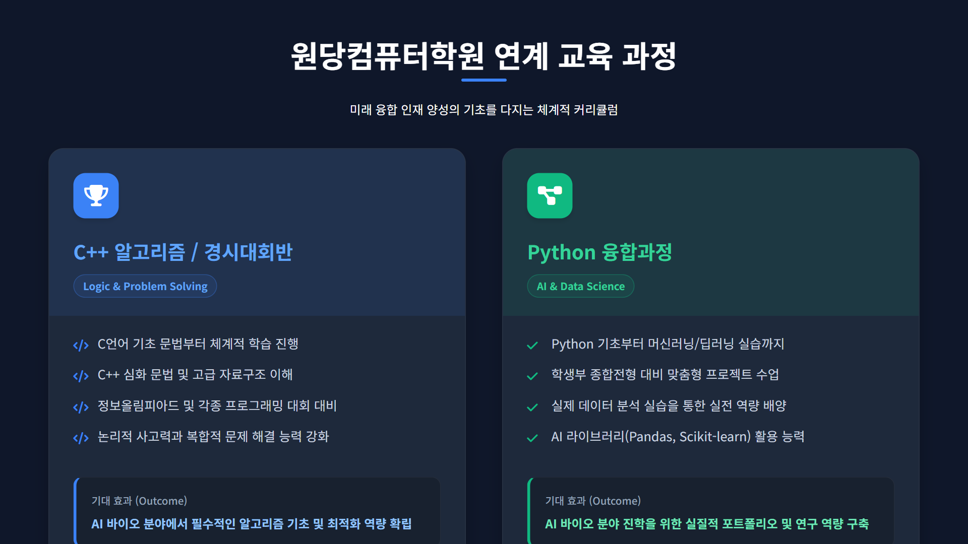 AI 바이오 영재학교와 같은 특화된 교육기관 진학을 준비하거나, 미래 바이오 산업의 핵심 인재로 성장하기 위해서는 탄탄한 프로그래밍 기초와 알고리즘 사고력이 필수입니다. 원당컴퓨터학원은 이러한 기초를 체계적으로 다질 수 있는 교육 과정을 운영하고 있습니다.