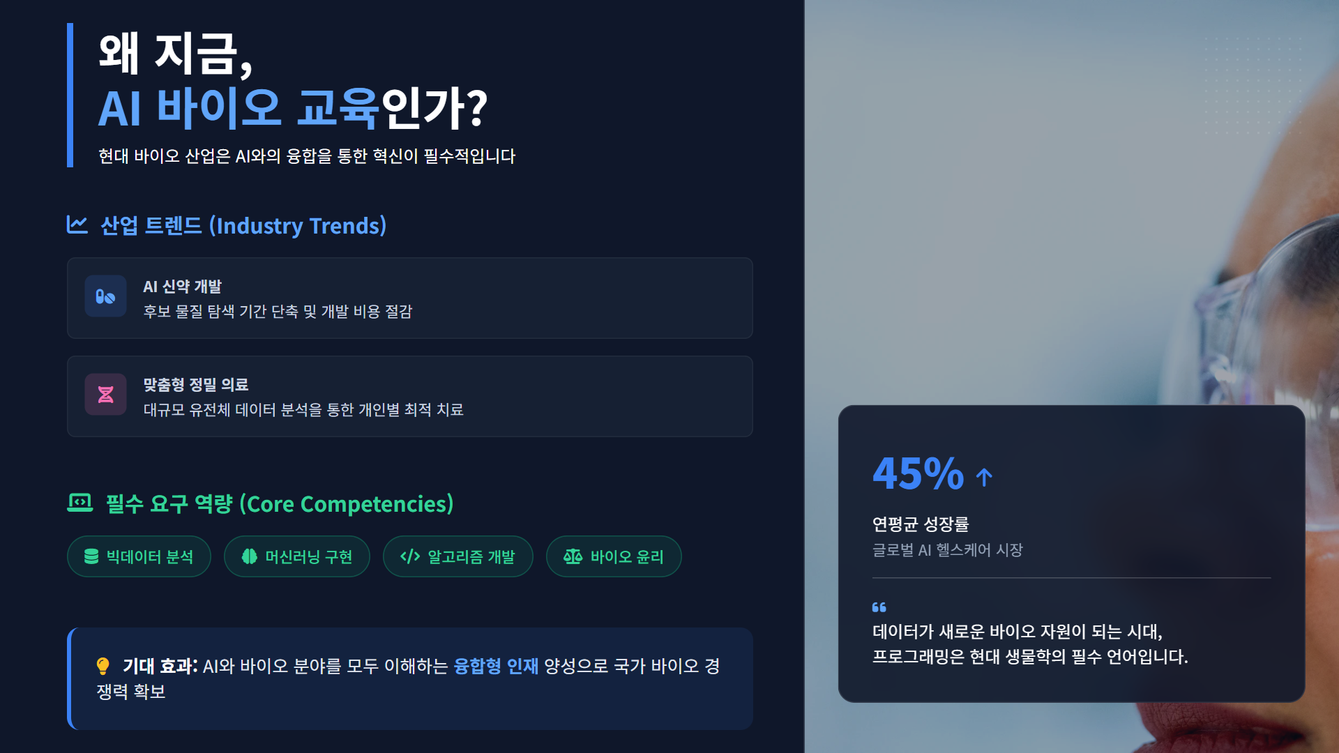 이러한 추세에 맞춰 AI와 바이오 분야를 모두 이해하는 융합형 인재의 필요성이 크게 증가하고 있습니다.
