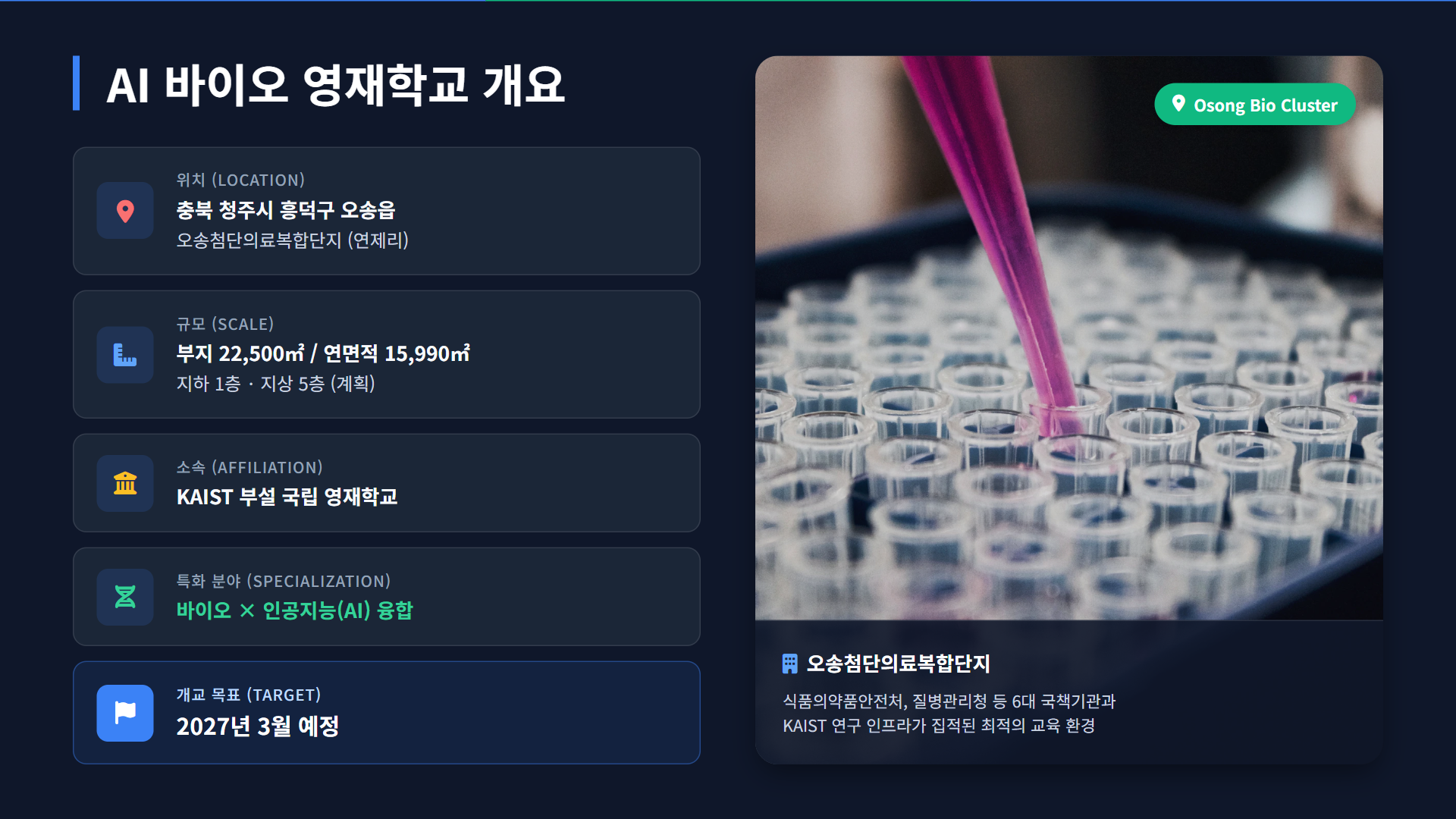 기사 출처: 교육을 비추다, "KAIST부설 'AI 바이오 영재학교' 부지 확정… 2027년 개교 잰걸음" (2025.11.20) https://www.kyobit.com/news/articleView.html?idxno=2516
