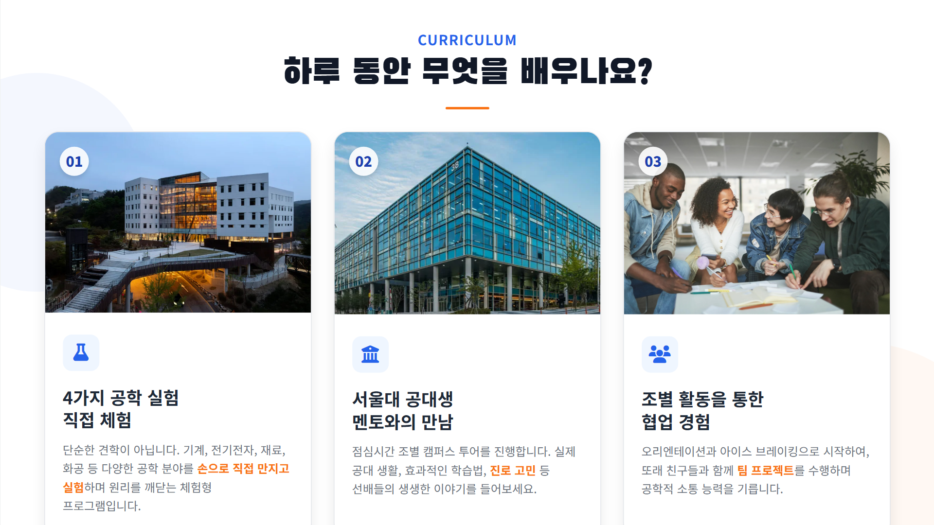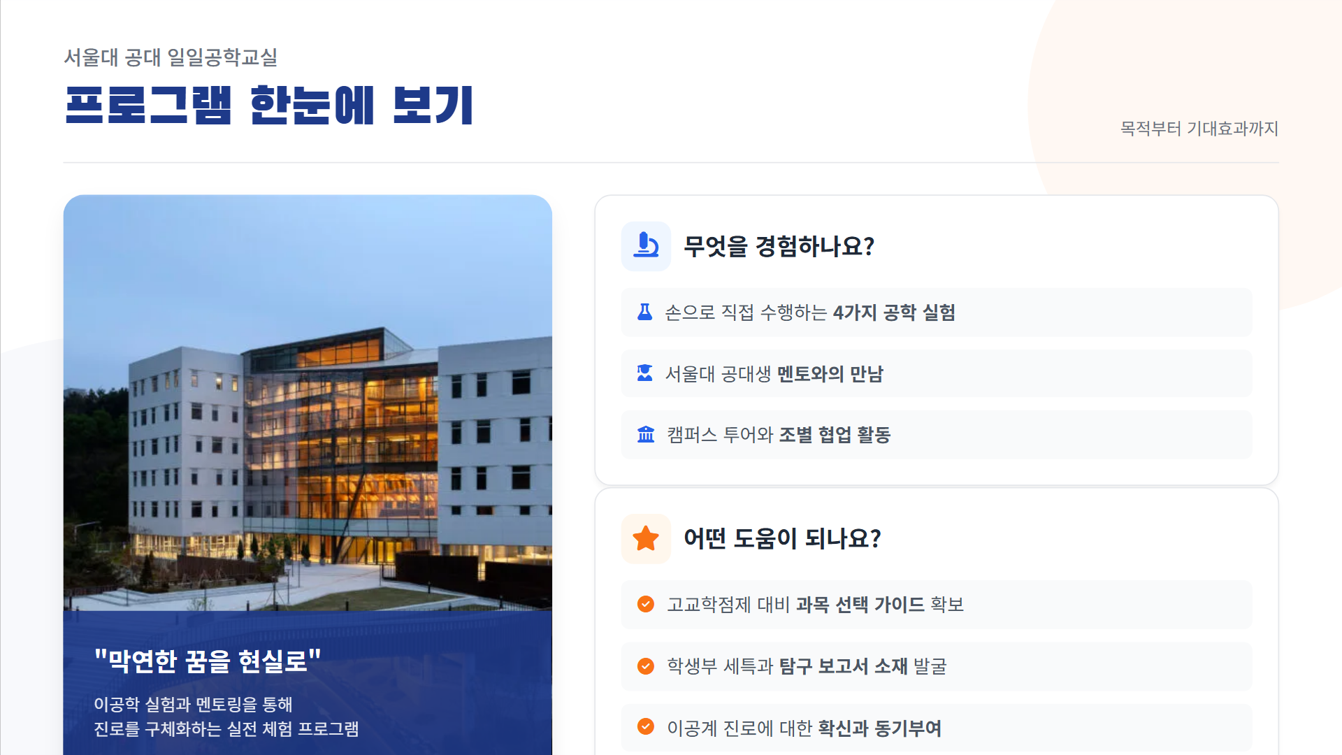 "공대가 나한테 맞을까?", "공학이 뭔지 잘 모르겠어" 하는 고민이 있다면, 하루 동안의 집중적인 체험이 큰 도움이 될 것입니다.