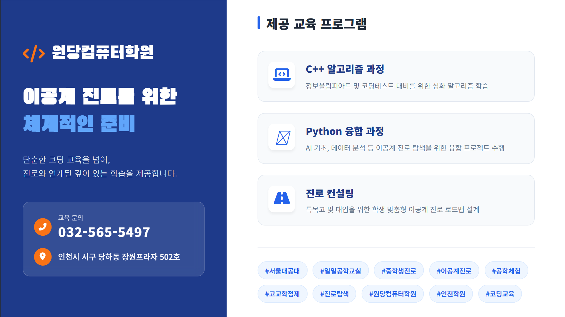 저희 원당컴퓨터학원에서는 C++ 알고리즘, Python 융합과정 등을 통해 많은 학생들이 이공계 진로를 준비하고 있습니다. 그 과정에서 보아온 바로는: