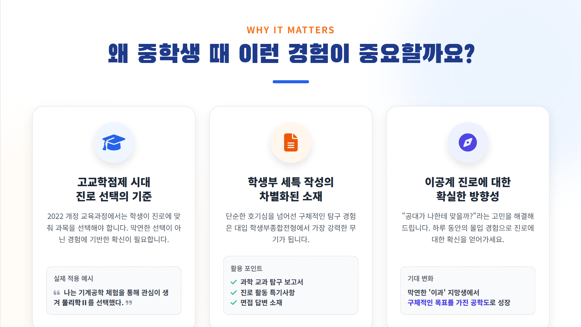 중학교 시절, 실제 공학 분야를 체험해보는 것은 고등학교에서 어떤 과목을 선택할지 결정하는 데 큰 도움이 됩니다.
