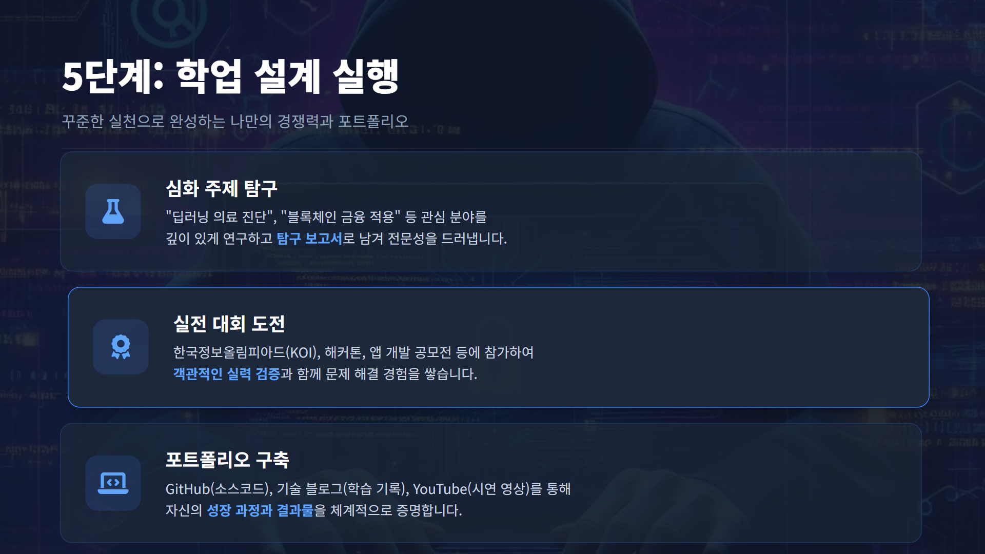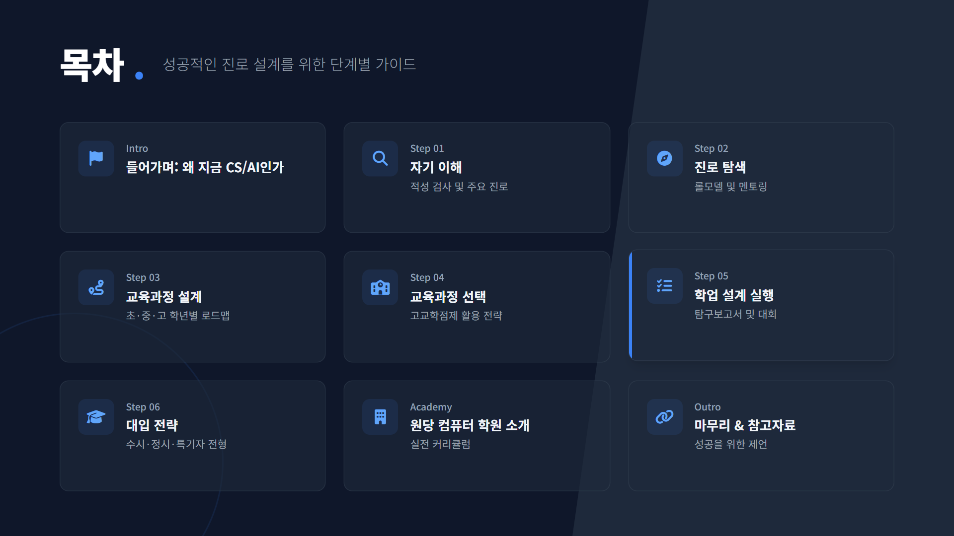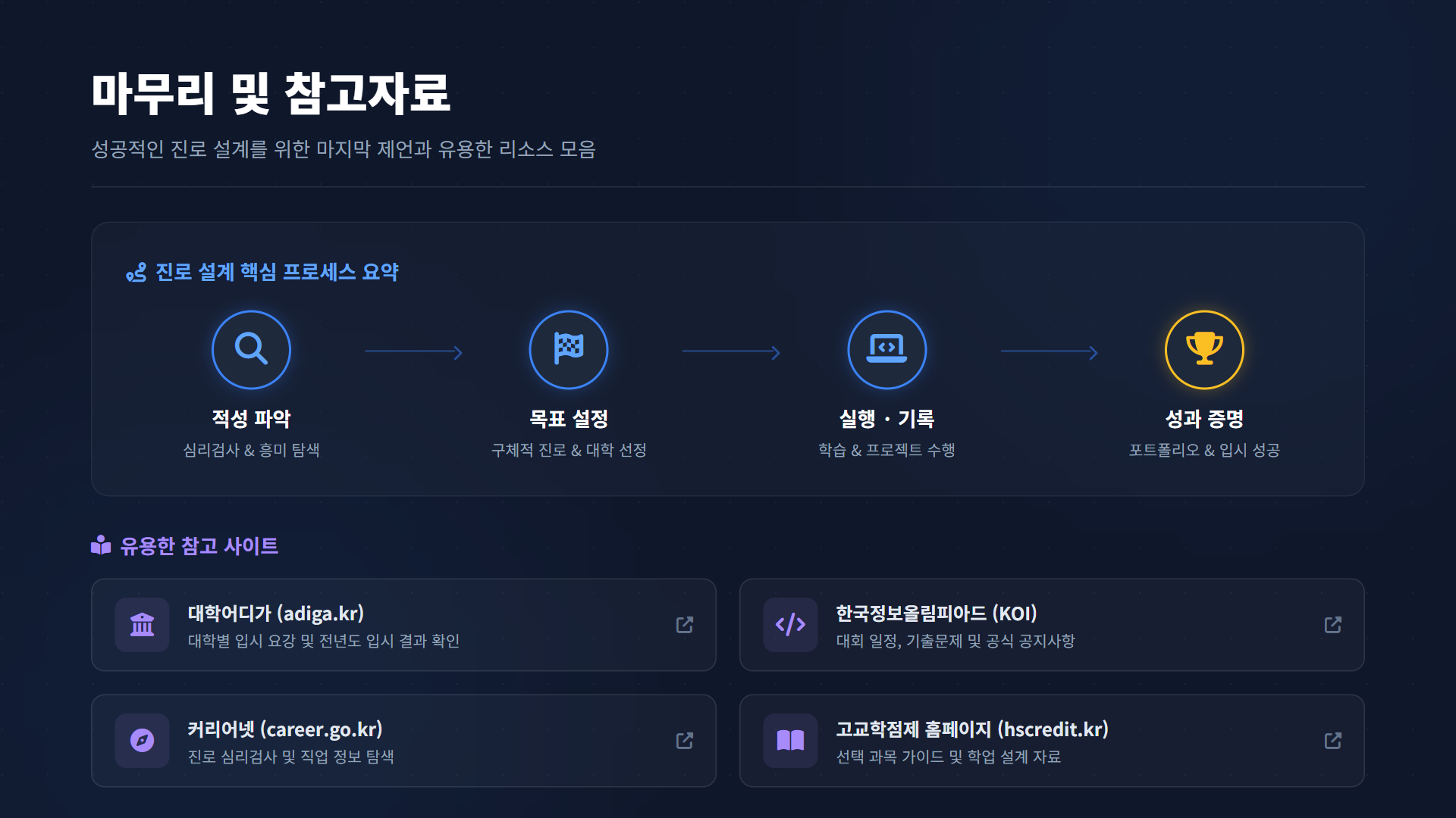 컴퓨터/AI/소프트웨어 진로는 체계적인 설계와 꾸준한 실천이 핵심입니다. 자신의 적성을 파악하고, 구체적인 목표를 세우고, 한 걸음씩 나아가다 보면 원하는 미래를 만들 수 있습니다.