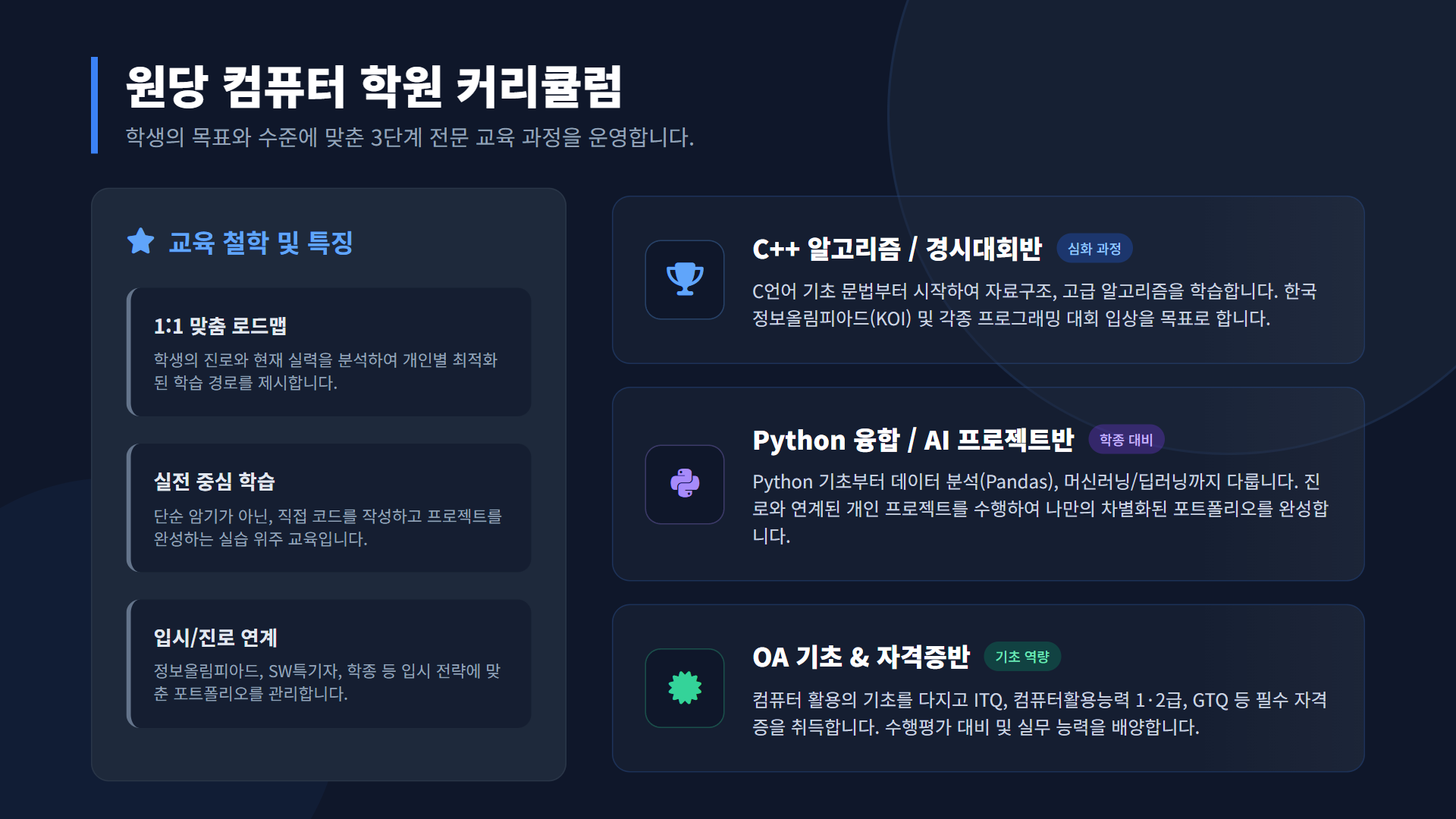 원당 컴퓨터 학원은 위의 진로 설계를 실제로 구현할 수 있도록 돕습니다.