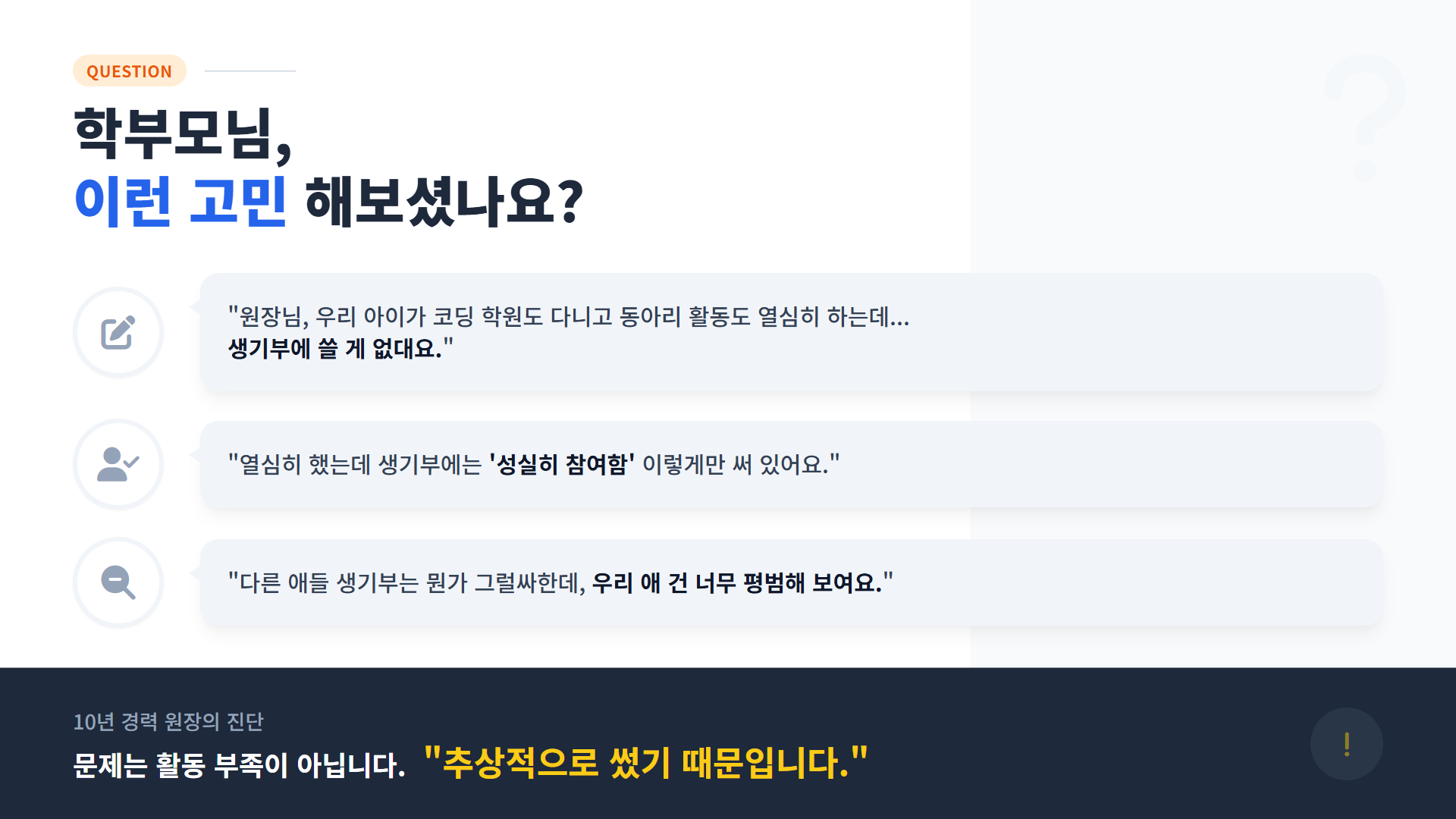 "원장님, 우리 아이가 코딩 학원도 다니고 동아리 활동도 열심히 하는데... 생기부에 쓸 게 없대요."