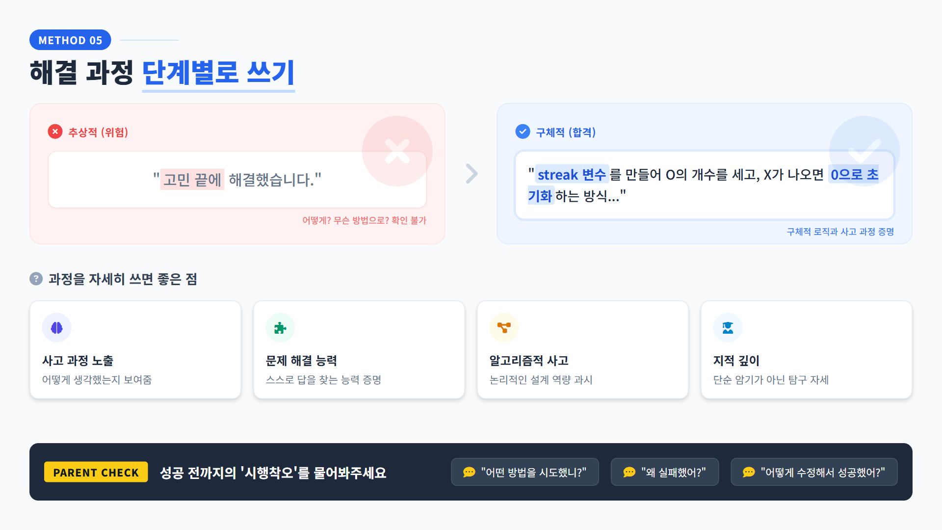 □ 해결 방법이 단계별로 나와있나요? (변수 도입 → 테스트 → 수정 등)