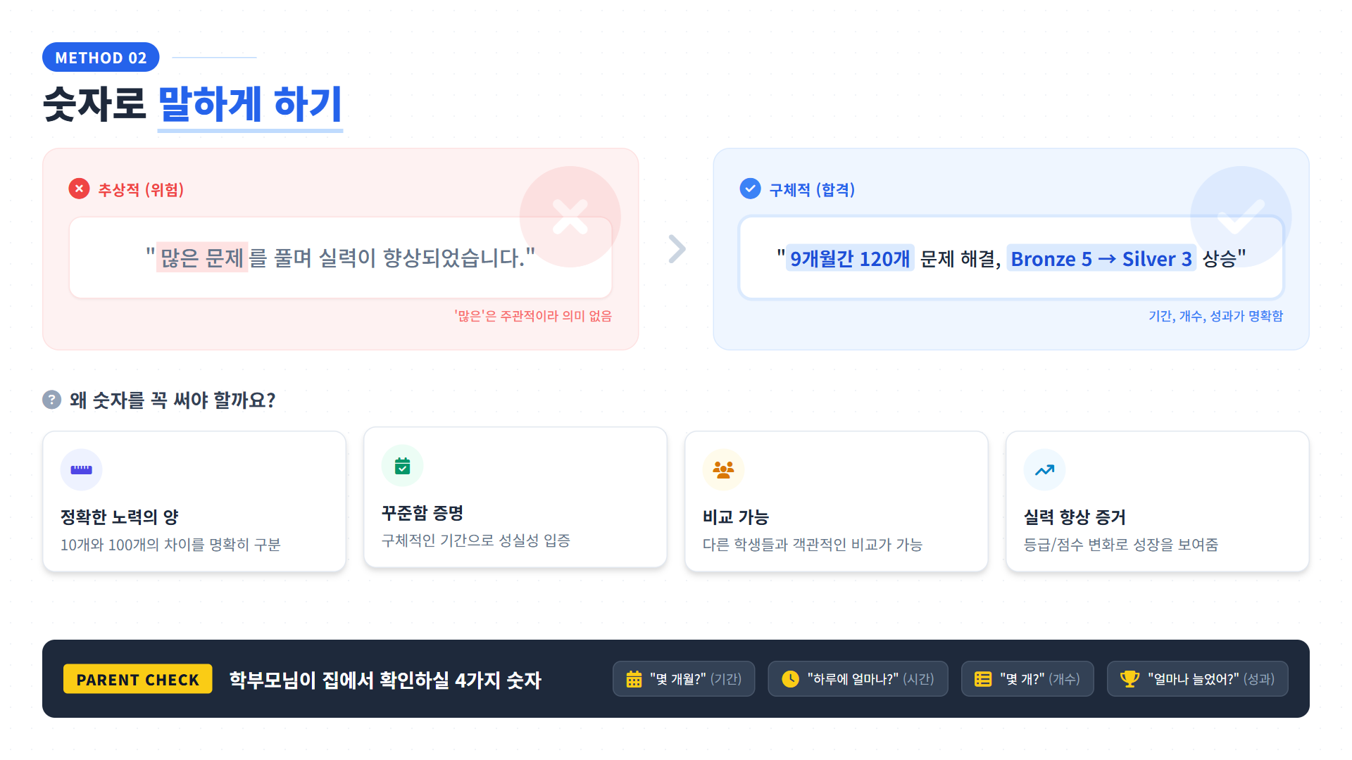 기간을 물어보세요. "몇 개월 했니?" → "9개월" 시간을 물어보세요. "하루에 얼마나?" → "매일 20분" 개수를 물어보세요. "몇 개 만들었어?" → "3개 프로젝트" 성과를 물어보세요. "실력이 얼마나 늘었어?" → "Bronze 5에서 Silver 3"