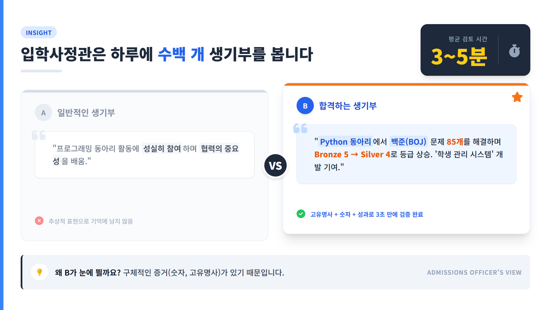 입학사정관이 학생 한 명당 생기부를 보는 시간, 평균 3~5분입니다.