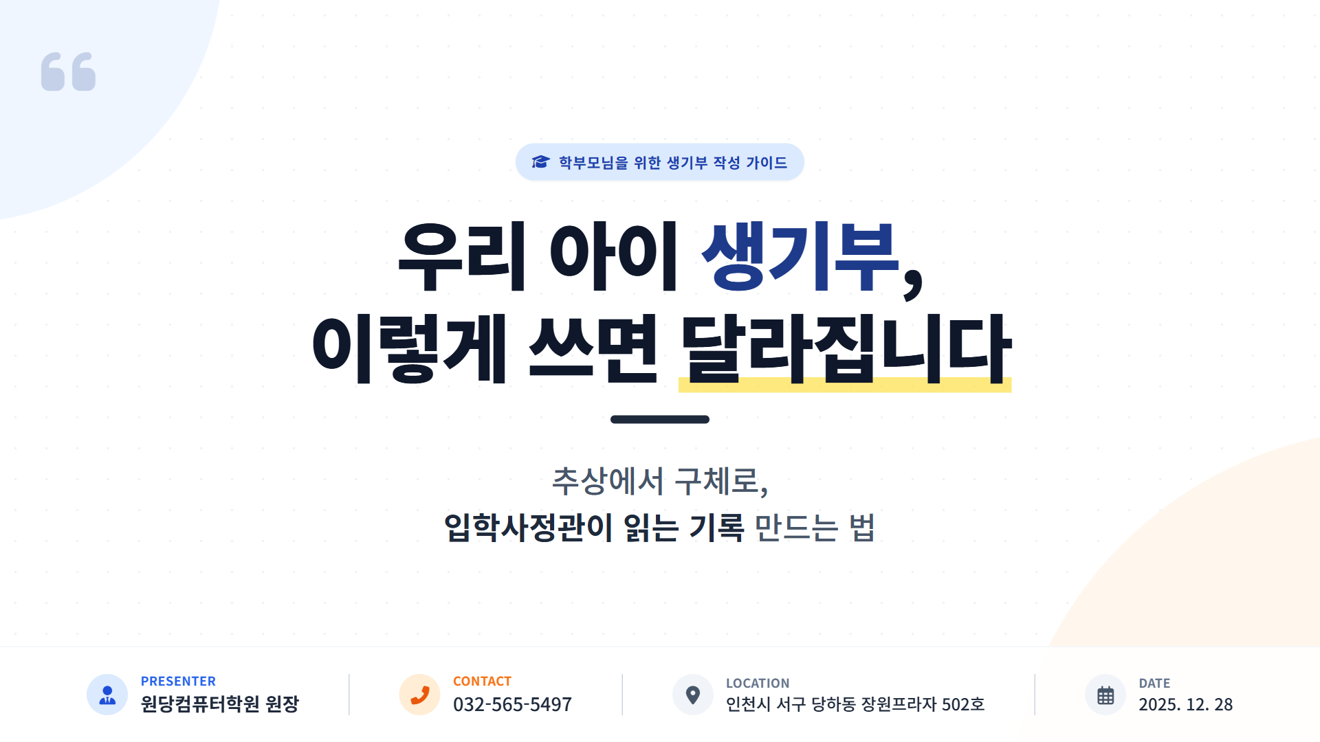 오늘은 학부모님께서 우리 아이의 생기부를 어떻게 도와주실 수 있는지, 구체적인 방법을 말씀드리겠습니다.
