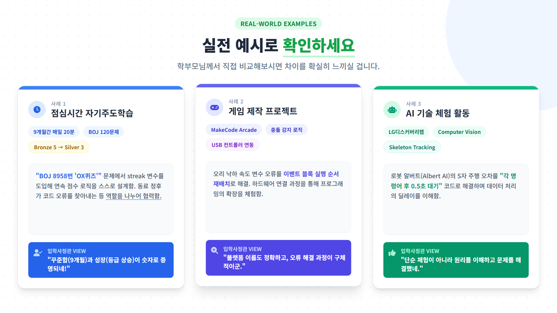 우리 학원에서 배운 내용은 구체적이고 검증 가능한 활동입니다. 백준 몇 문제를 풀었는지, 어떤 프로젝트를 만들었는지, 어떤 개념을 배웠는지 명확하게 말씀드릴 수 있습니다.