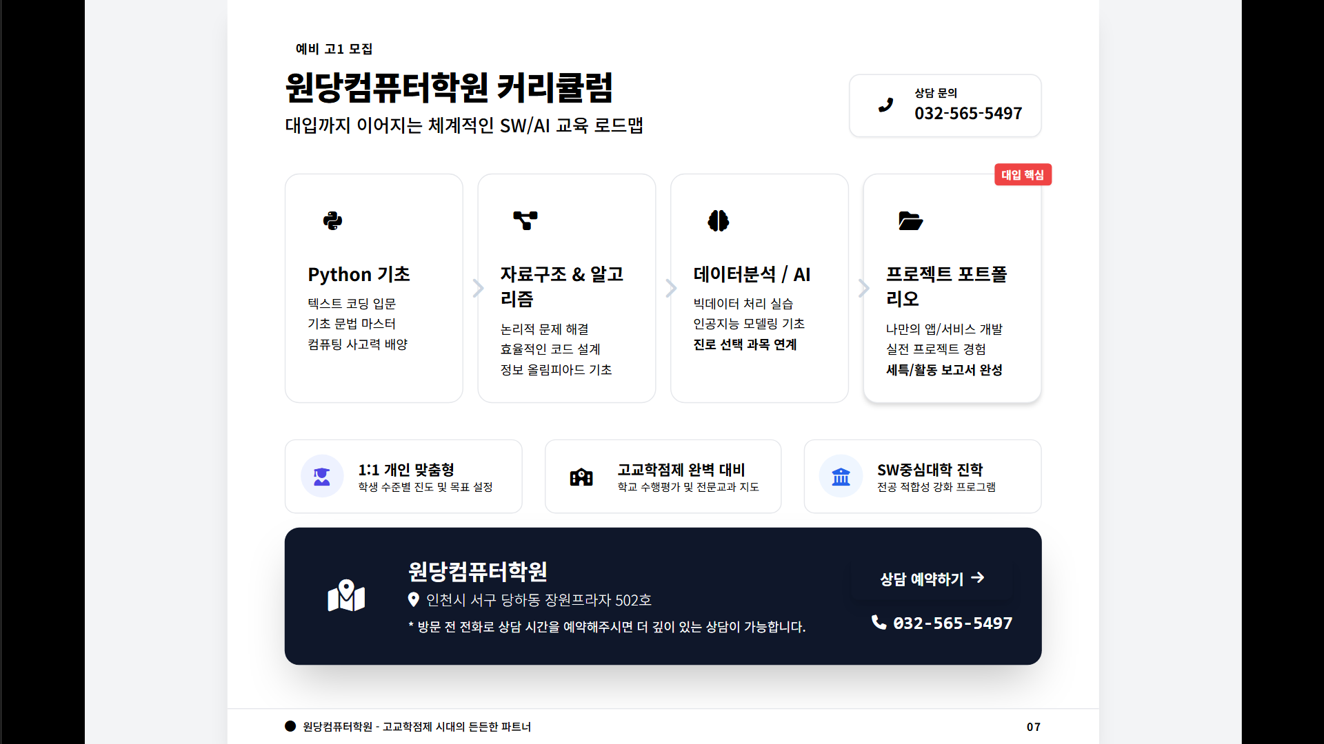 저희 원당컴퓨터학원에서도 예비 고1 학생들 대상으로 Python 기초부터 시작해서 대학 진학까지 연계되는 커리큘럼을 준비하고 있습니다. 고교학점제 시대에 맞춰 학생 개개인의 진로에 따른 맞춤형 수업을 진행하고 있으니, 궁금하신 분은 언제든 연락 주세요.