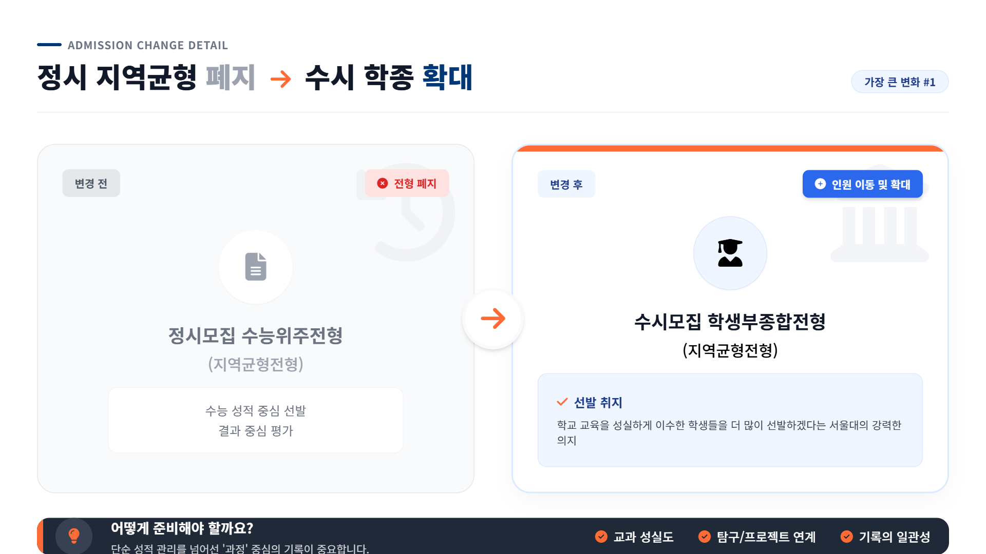 가장 큰 변화는 정시모집의 수능위주전형(지역균형전형)이 완전히 폐지되고, 그 인원이 수시모집 학생부종합전형(지역균형전형)으로 이동한다는 점입니다. 이는 서울대가 학교 교육을 성실하게 이수한 학생들을 더 많이 선발하겠다는 의지를 보여주는 것입니다.