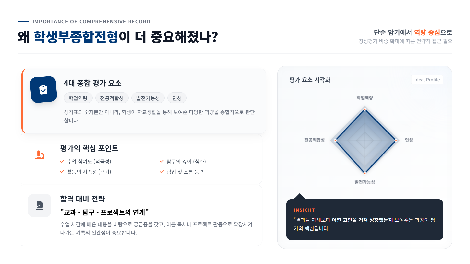 이번 입학전형 변화는 학생부종합전형의 중요성을 더욱 강조하고 있습니다. 학생부종합전형에서는 단순히 내신 성적뿐만 아니라, 학생의 학업 역량, 전공 적합성, 발전 가능성 등을 종합적으로 평가합니다.