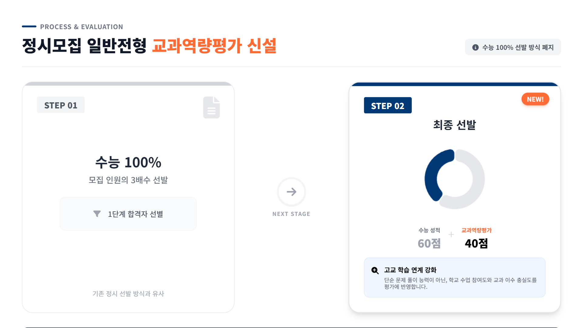 정시모집 일반전형에서는 1단계에서 수능 100%로 3배수를 선발한 후, 2단계에서 수능 60점과 교과역량평가 40점을 반영합니다. 수능만으로 결정되던 기존 방식에서 벗어나 고교 학습과의 연계를 강화한 것입니다.