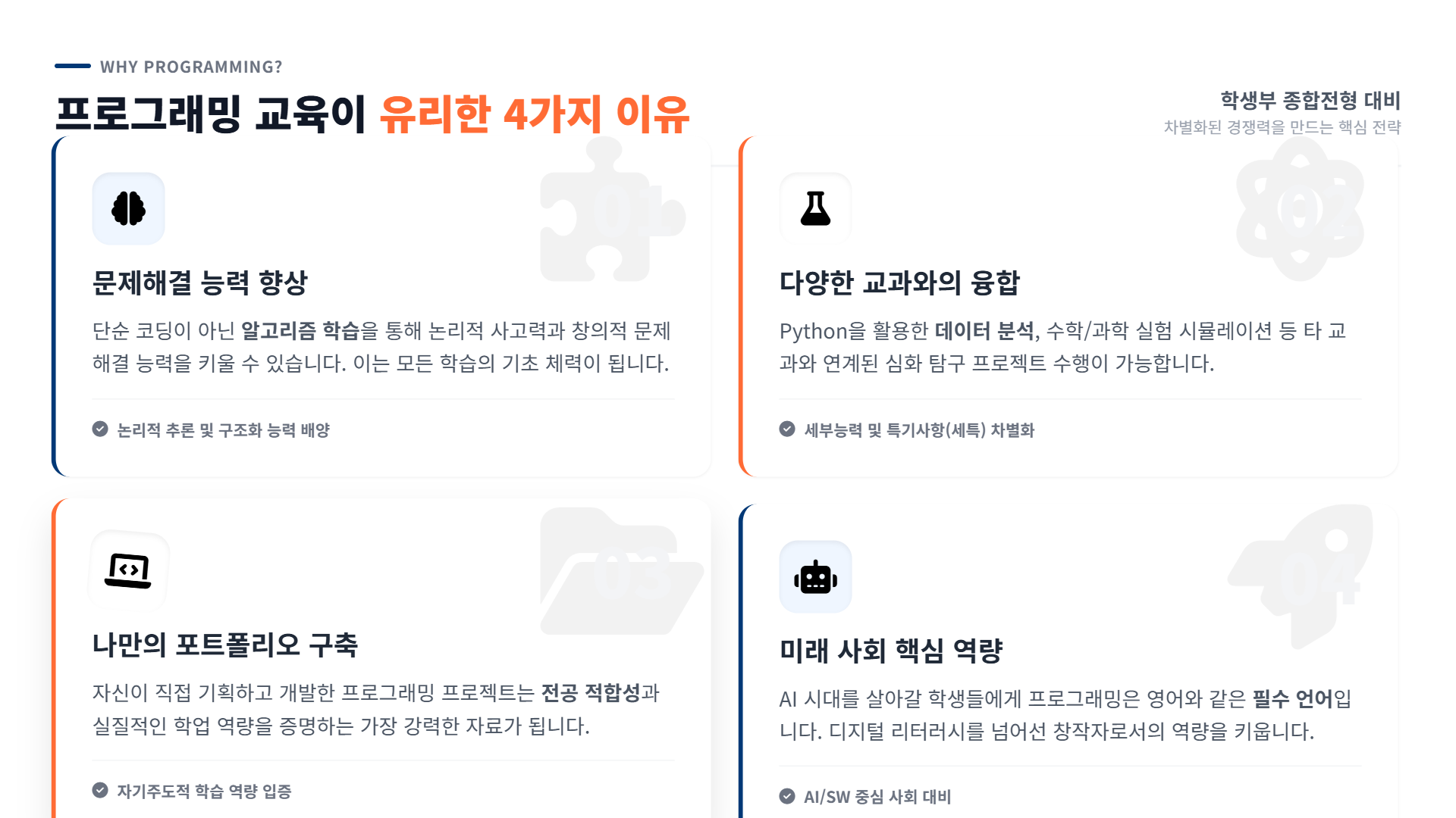- 미래 사회 대비: AI 시대를 살아갈 학생들에게 프로그래밍은 필수 역량입니다