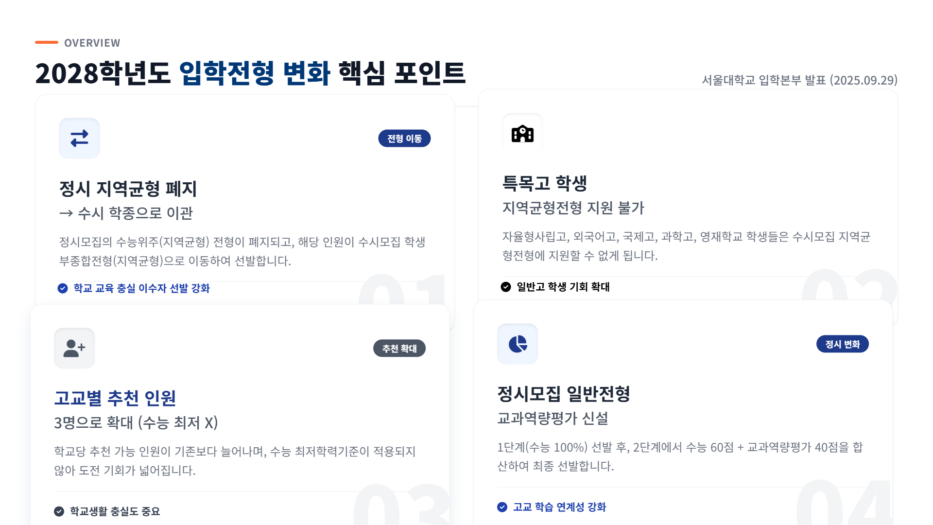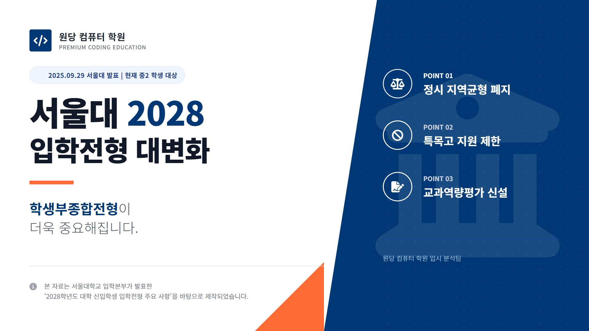 서울대학교가 2025년 9월 29일 발표한 2028학년도 입학전형 주요 사항을 학부모님들과 공유하고자 합니다. 이번 변화는 현재 고등학교 1학년 학생들이 대학에 진학할 때 적용되는 내용으로, 미리 준비하시는 것이 중요합니다.
