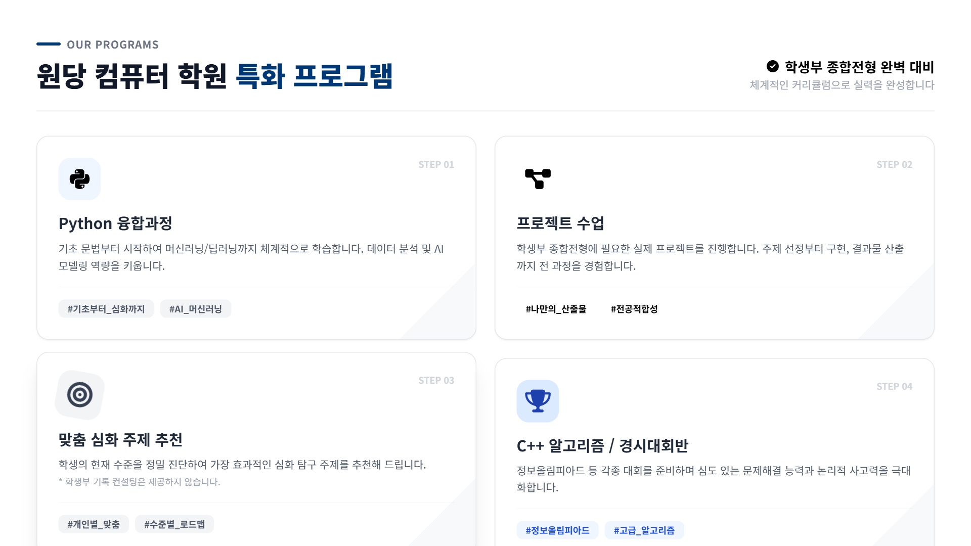Python 융합과정을 통해 Python 기초부터 머신러닝/딥러닝까지 체계적으로 학습하며, 학생부 종합전형에 필요한 프로젝트 수업을 진행합니다.