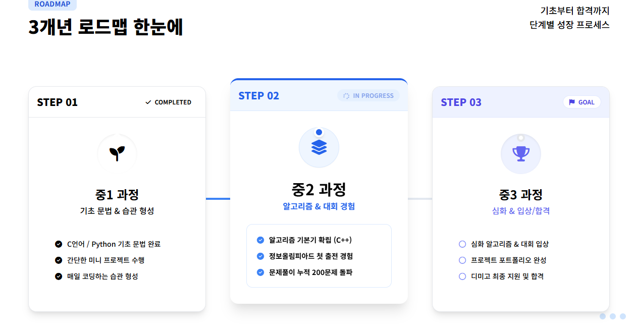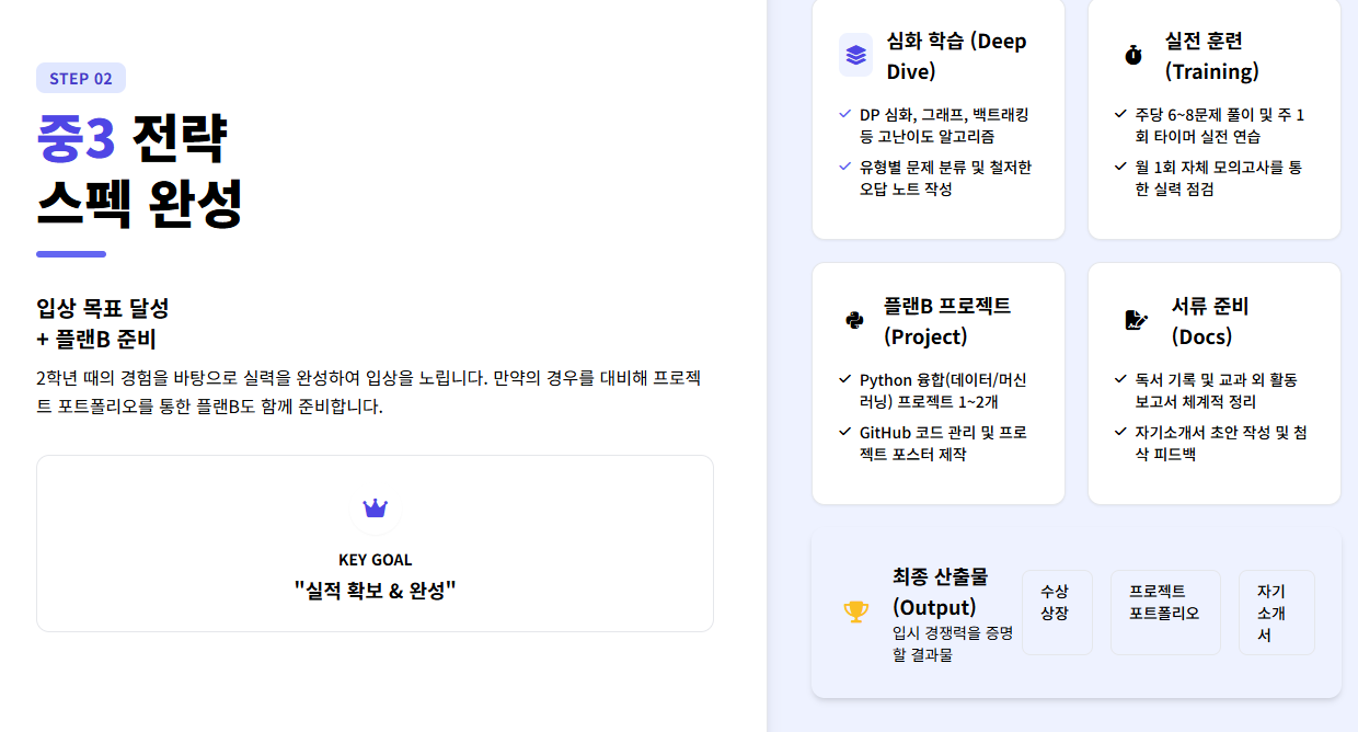 - 정보올림피아드 입상 목표: 2학년 때의 경험을 바탕으로 실력을 한 단계 끌어올려 입상을 노립니다.