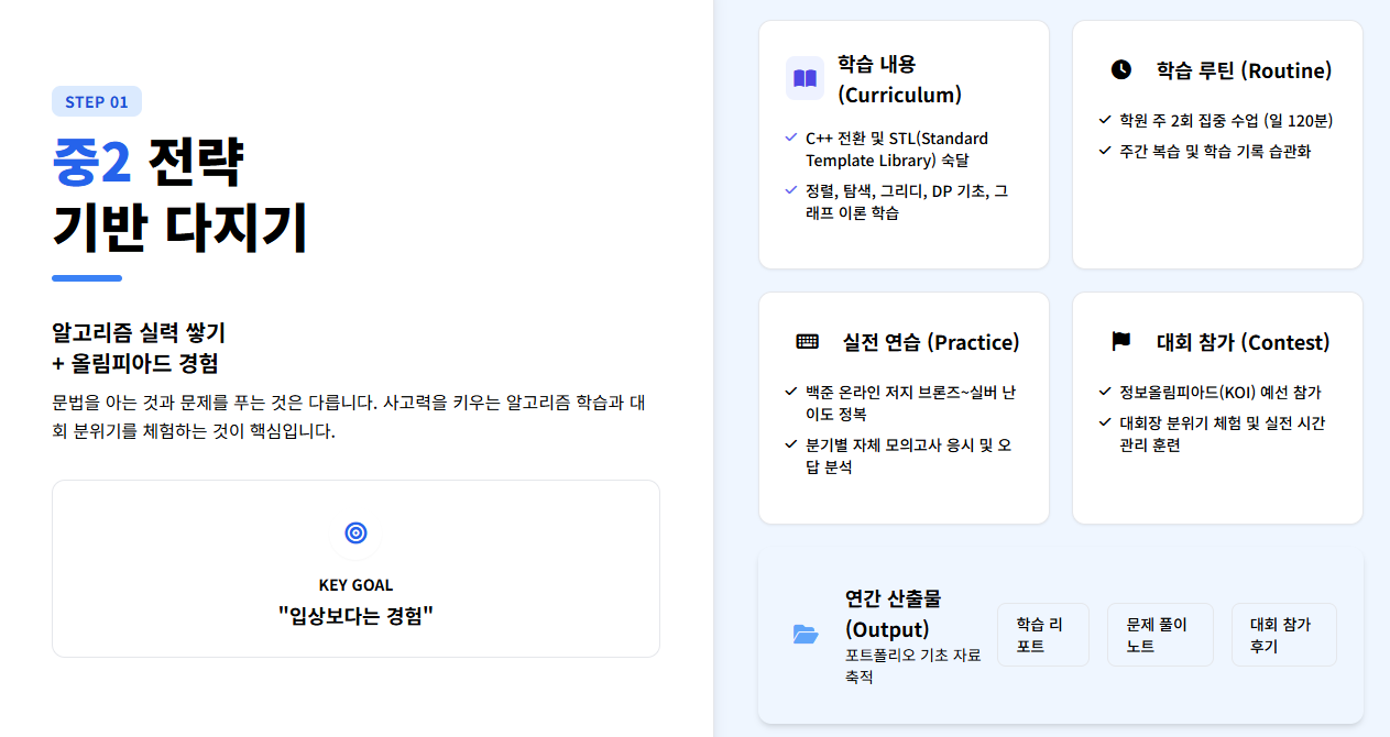 - 알고리즘 과정 집중 학습: 문법을 아는 것과 문제를 푸는 것은 다릅니다. 이제부터는 사고력을 키우는 알고리즘 학습이 필요합니다.