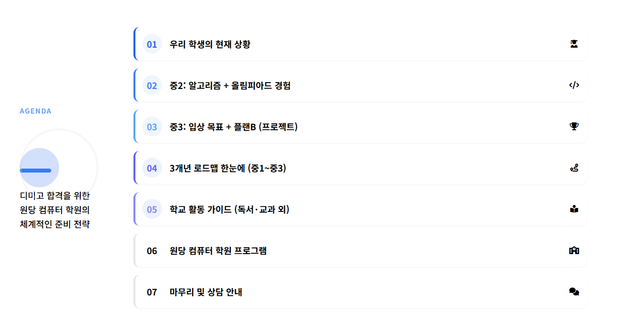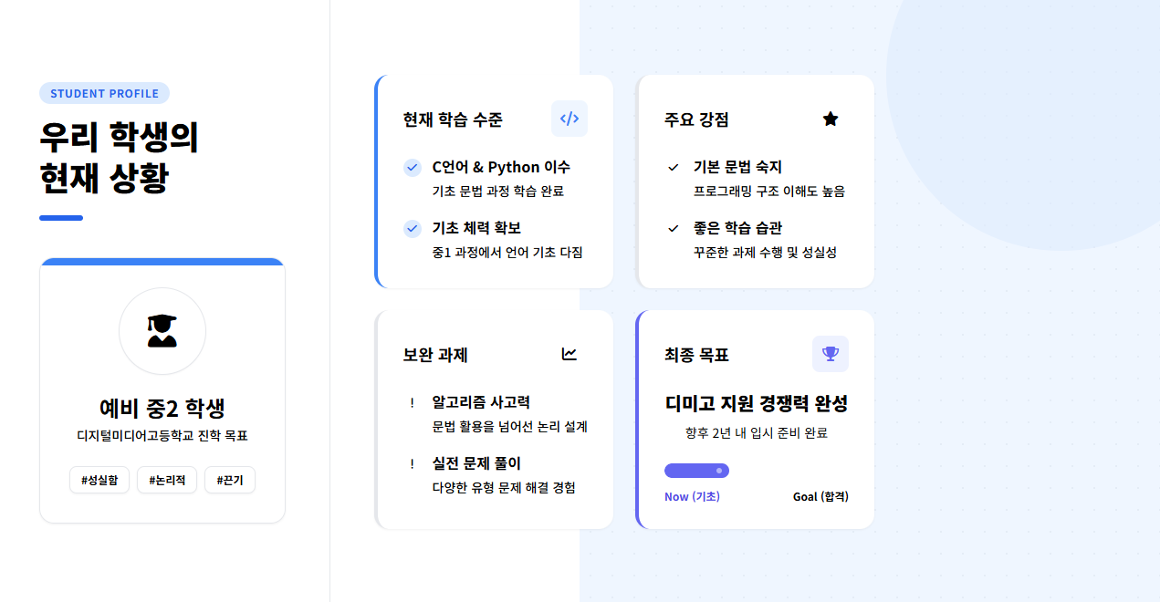 상담하신 학생은 이미 C언어와 Python 문법 과정을 마친 상태였습니다. 중1 과정에서 두 가지 프로그래밍 언어의 기초를 다졌다는 것은 정말 큰 강점입니다. 이제 본격적으로 디미고 입시를 준비할 수 있는 기반이 마련된 셈이죠.