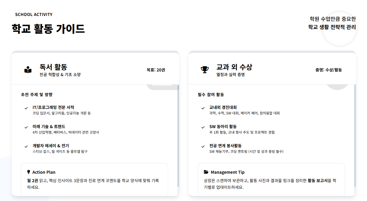 중요한 것은 학원에서의 실력 향상과 학교에서의 활동 기록을 함께 준비하는 것입니다. 학원에서 실력을 쌓고, 학교에서 그 실력을 증명하는 다양한 활동에 참여하세요.