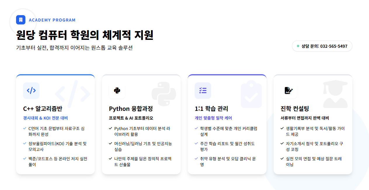 저희 원당 컴퓨터 학원에서는 디미고를 비롯한 특성화고 진학을 목표로 하는 학생들을 위해 C++ 알고리즘/경시대회반을 운영하고 있습니다. C언어 기초 문법부터 정보올림피아드와 같은 경시대회 준비까지 체계적으로 지도합니다.