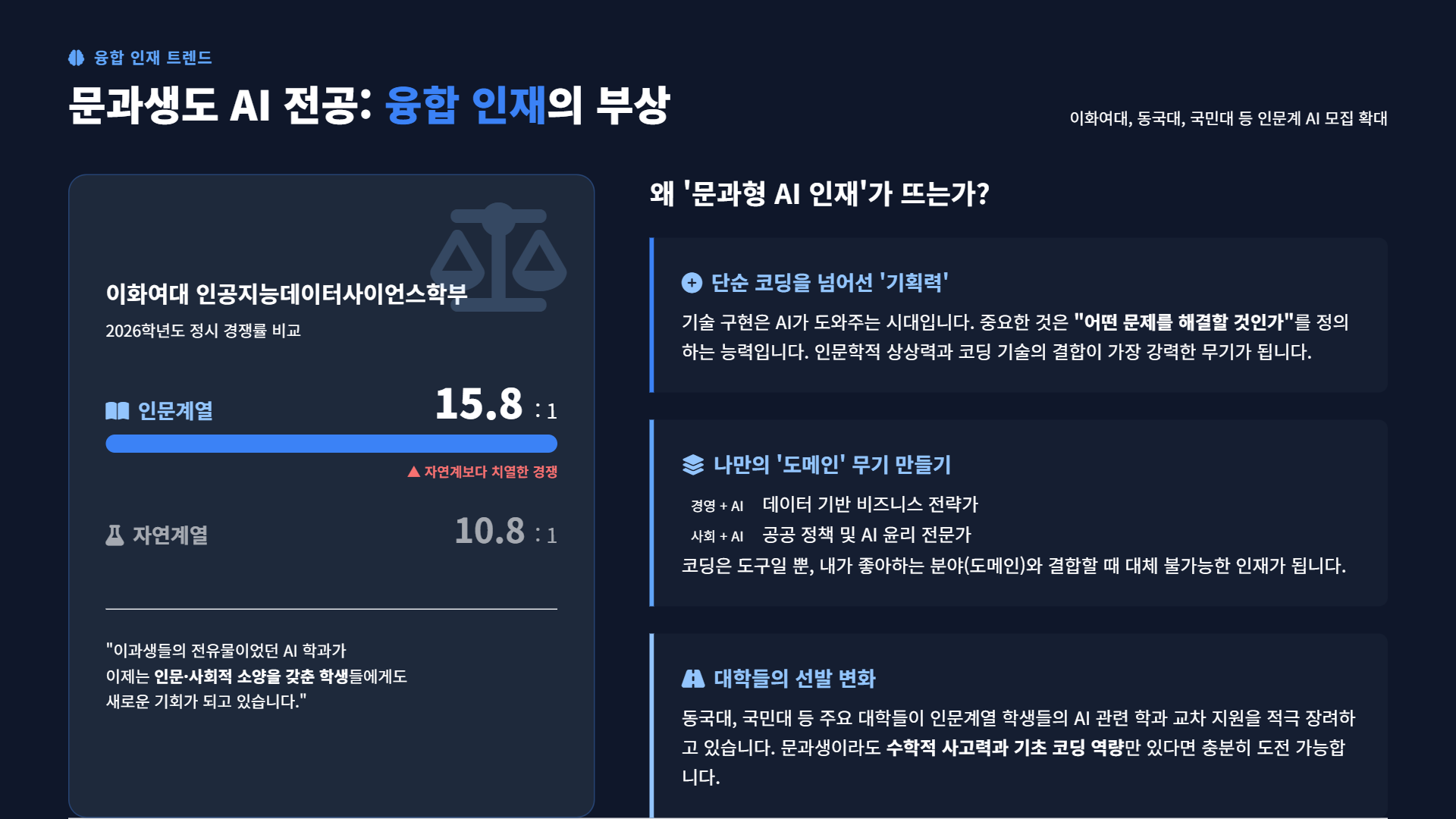 더 주목할 만한 점은 이게 이과생들만의 이야기가 아니라는 겁니다. 이화여대 인공지능데이터사이언스학부는 인문계열 모집에서 15.8대 1의 경쟁률을 기록했는데, 이건 자연계열 10.8대 1보다 오히려 높은 수치입니다. 동국대, 국민대 같은 대학들도 인문계 AI 학과 지원자가 계속 늘고 있고요.