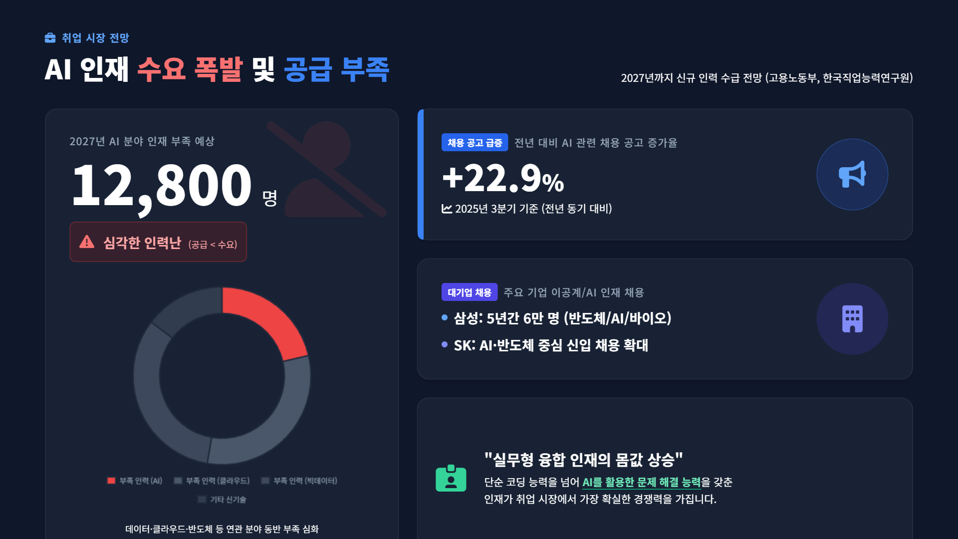 더 중요한 건 취업 시장입니다. 한국직업능력연구원에 따르면 2027년까지 AI 분야에서만 약 12,800명의 인재가 부족할 것으로 예상됩니다. 삼성이 AI와 반도체 중심으로 6만 명을 채용한다고 발표했고, SK그룹도 공격적으로 이공계 인재를 뽑고 있습니다. 실제로 2025년 3분기까지 AI 관련 채용 공고가 전년 대비 22.9%나 급증했다고 하네요.
