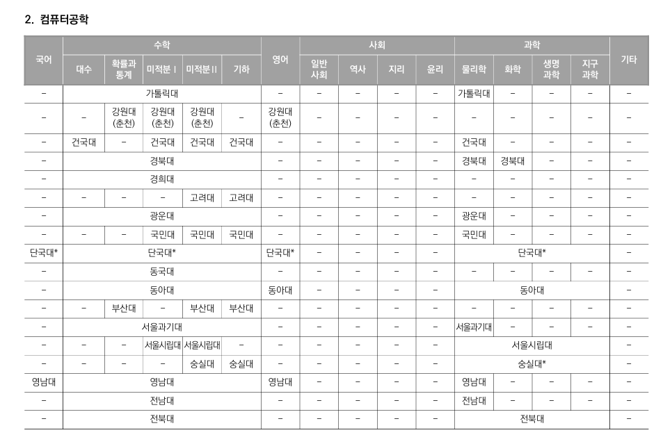 영남대, 연세대(원주), 전남대, 전북대 등에서 정보 과목을 권장하고 있습니다. 특히 컴퓨터공학과의 특성상 정보 과목은 전공 적합성을 보여줄 수 있는 중요한 과목입니다.