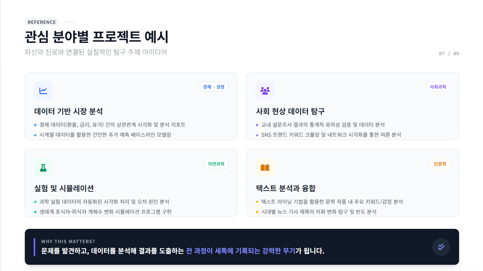 문제를 발견하고, 데이터를 수집하고, 분석하고, 결과를 도출하는 전 과정이 학생 주도적 탐구의 완벽한 사례가 되기 때문입니다.