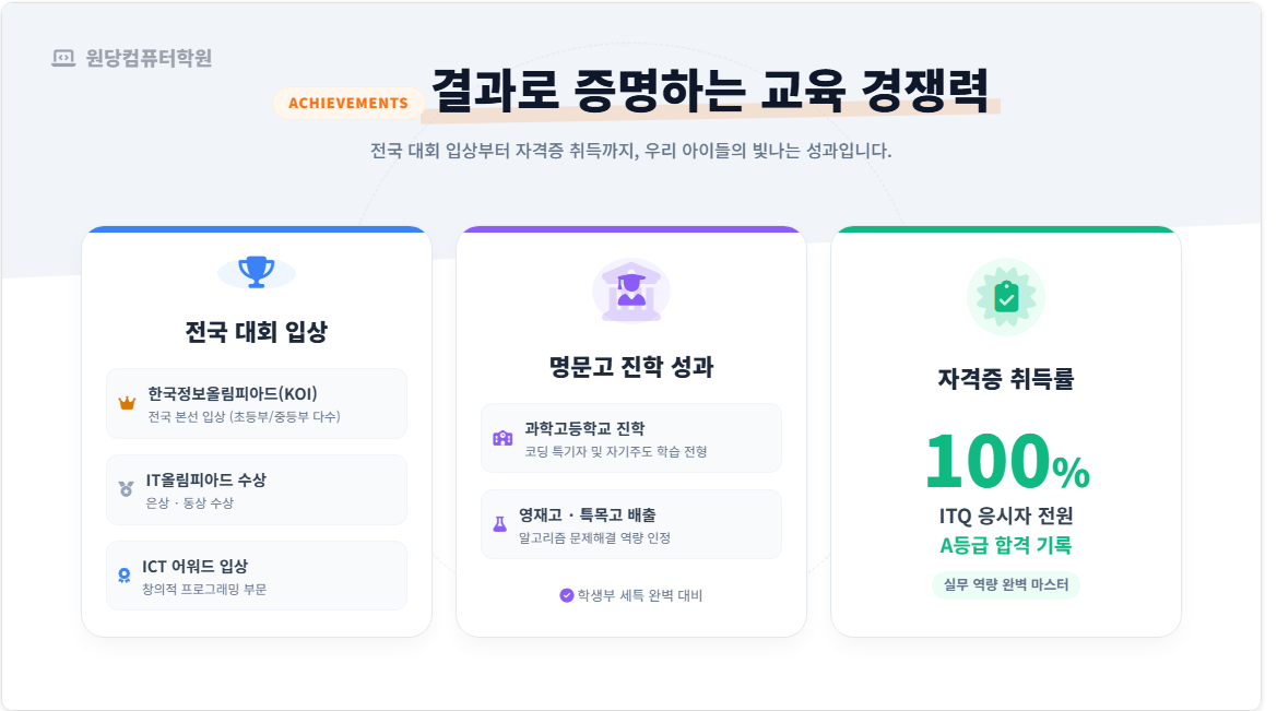 저희 학원의 입상 실적을 간략히 소개하자면, 한국정보올림피아드 전국 본선 입상(초등부·중등부 다수), IT올림피아드 은상·동상 수상, ICT어워드 입상 등이 있으며 과학고·특목고 진학생도 꾸준히 배출하고 있습니다.